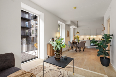 Lejligheden har en smart planløsning med stort, åbent opholdsrum hvor køkken og stue samler hverdagen. Dertil 2 regulære værelser.