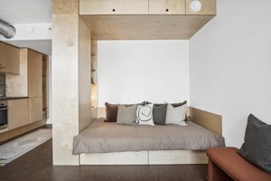 Det centrale multimøbel fungerer både som sofa og seng og er omkranset af integrerede skabe, hylder og gennemtænkt opbevaring fra gulv til loft. Ét møbel med mange funktioner og masser af luft i hverdagen.
