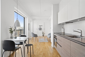Lejligheden byder på et lyst og rummeligt køkken/alrum med alle nødvendige hårde hvidevarer, god plads til spiseområde og sofaarrangement. Badeværelset er stort og funktionelt med gode opbevaringsmuligheder. Derudover får du to regulære værelser med gode indretningsmuligheder.