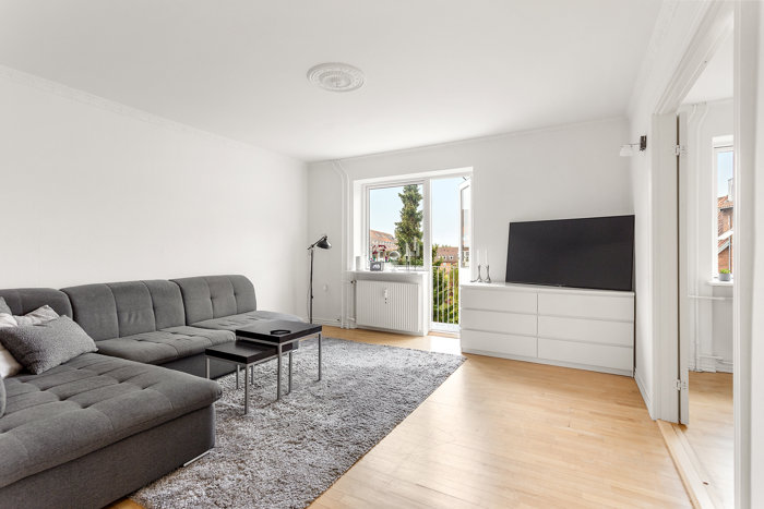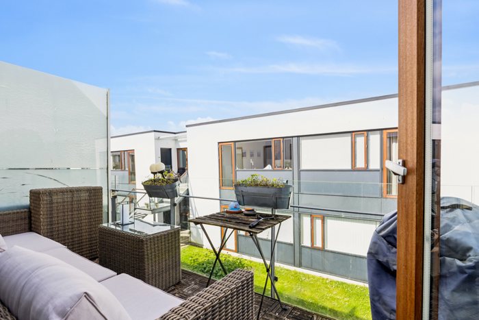 Et af boligens helt store plusser er den skønne altan, som nås direkte fra stuen. Her kan du nyde solen, et måltid under åben himmel eller bare slappe af i hyggelige loungemøbler – et skønt, privat uderum midt i byen.