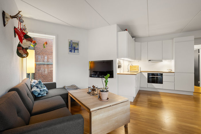 Fra det ene værelse er der adgang til en charmerende hems, som giver boligen ekstra fleksibilitet. Den kan bruges som gæsteplads, ekstra opbevaring eller et lille privat frirum – en sjældent god mulighed i denne type lejlighed.