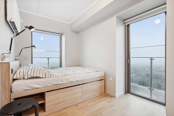 A specially designed 2-room Tom Dixon rental apartment with many functional solutions and a lovely balcony that embraces the apartment with a fantastic view. This apartment has an open-plan kitchen and living room with direct access to one of the apartment's two balconies. The kitchen is both stylish and optimally designed. All appliances are included. The bedroom offers a 160x200cm bed and a wardrobe arrangement with two tall cabinets and a nice desk with matching wall cabinets. This apartment offers good storage options with click-lock drawers and cabinets. The bathroom is equipped with light-colored tiles and a separate shower.