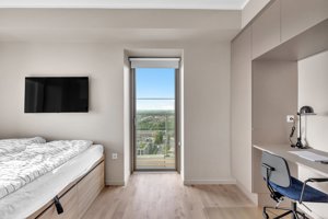 A specially designed two-bedroom rental apartment with many functional solutions and a lovely balcony that embraces the apartment with a fantastic view. This apartment has an open kitchen-living room with direct access to one of the apartment's two balconies. The kitchen is both stylish and optimally designed. The bedroom offers a 160x200cm bed and a wardrobe arrangement with two tall cabinets and a nice desk with matching wall cabinets. This apartment offers good storage options with click drawers and cabinets. The bathroom is equipped with light-colored tiles and a separate shower.