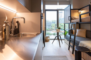 Welcome to apartment type A. A custom-designed Tom Dixon one-bedroom rental with many functional solutions and a lovely terrace. This fantastic apartment has a stylish kitchen with an optimal layout, where you have all the appliances integrated in the kitchen. A nice little dining area with an additional table top, so there is room for more people. The bed in the apartment functions as a bunkbed. This is both comfortable and practical with plenty of storage space. With this home, you generally get good storage options with click drawers and cabinets. The apartment is also equipped with a flexdesk that can be used as a desk or as an alcove. The bathroom is spacious with light-colored tiles and a separate shower.