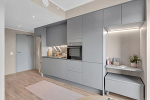 Den smarte indretning giver både plads og fleksibilitet – med en multifunktionel soveplads, integreret opbevaring og en flex-desk, der kan bruges som hjemmekontor eller hyggelig alkove. Badeværelset er lyst og velindrettet med separat bruseniche.
