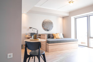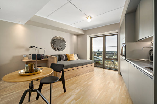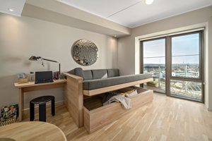 The open floor plan combines the kitchen and living room in a bright and stylish environment. The smart bed functions as both a sofa and a sleeping area, and plenty of storage space has been incorporated. In addition, the apartment offers a practical flex desk. The bathroom is modern and bright with a separate shower.