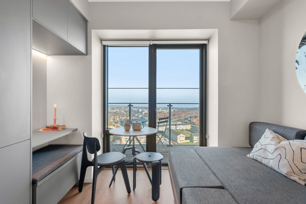 Here you get a well-designed 1-bedroom apartment with functional solutions and a lovely balcony. The open floor plan combines the kitchen and living room in a bright and stylish environment. The smart bed functions as both a sofa and a sleeping area, and good storage has been taken into consideration.