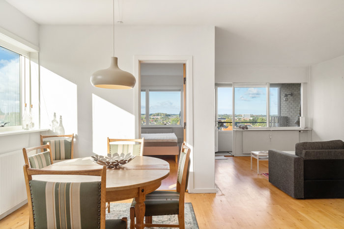 "Vi bruger meget tid i stuen, og det er også her vi slapper af. men ellers vil jeg sige altanen der vender helt rigtigt. Vi får aftensolen, har kig ud på legepladsen. I og med, at lejligheden ligger til venstre, betyder det også, at der er et skønt kig fra altanen mod syd ud over sø og skov."