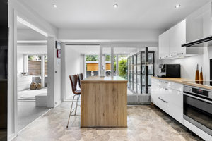 Den store stue fungerer som boligens naturlige samlingspunkt med rigelig plads til både sofaarrangement og hyggelige opholdsstunder. Køkkenet, der ligeledes blev renoveret i 2020, præsenterer sig flot med lyse, hvide fronter og et tidløst design, der indbyder til madlavning og samvær.