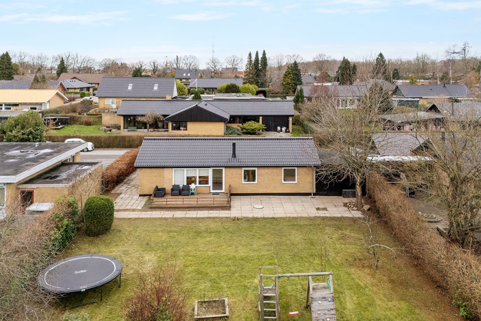 Haven er delt op i to smarte sektioner, som indbyder til både afslapning og aktivitet. Den ene del er perfekt til hyggelige grillaftener i solen, mens den anden del er oplagt til boldspil og leg med børnene.
