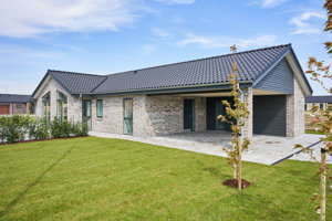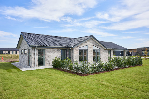 Den nyopførte villa på Ellemosevej 11C fremstår med en enkel, nutidig arkitektur. De lyse mursten, det mørke tag og de store vinduespartier skaber et roligt udtryk, mens den regulære grund giver gode muligheder for at forme de fremtidige udearealer.