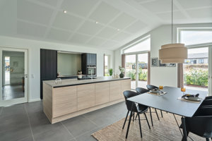 Køkken/alrummet bliver hjemmets samlingspunkt. Det ligger centralt med og god plads til et stort spisebord, hvor måltider, lektier og samvær kan samles. Den åbne forbindelse til stuen skaber et sammenhængende opholdsmiljø, hvor flere kan være i gang med hver sit uden at være adskilt. Fra køkken/alrummet er der direkte udgang til haven, som binder inde- og udeliv naturligt sammen.