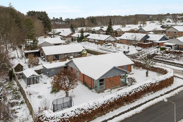 Villaen er udstyret med en energibesparende varmepumpe, hvilket bidrager til en fornuftig driftsøkonomi. Den integrerede carport giver nem adgang og ekstra beskyttelse til bil og opbevaring.