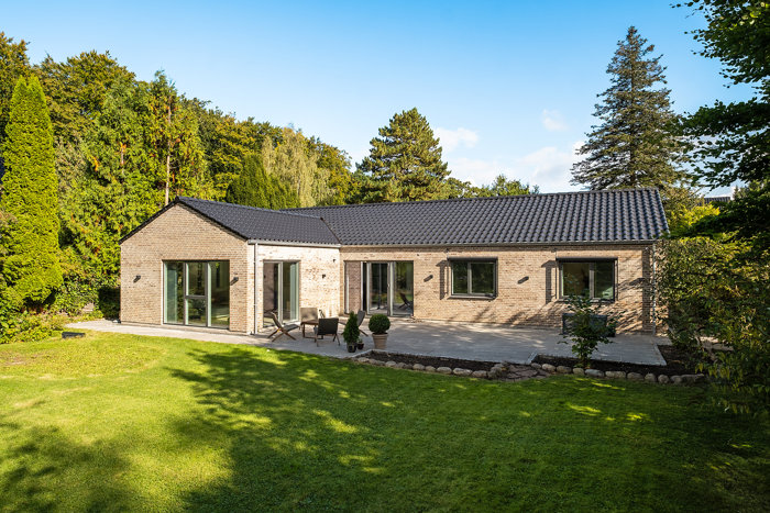 Her åbner et boligkapitel, hvor lys, design og en praktisk plan går hånd i hånd med minimal vedligeholdelse. Det minimalistiske udtryk holder år efter år, mens den brede indkørsel fører til bryggerset. I haven får I velanlagte terrasser, der giver både privatliv og sol fra morgen til aften – perfekt til morgenkaffe eller aftensolens sidste stråler.