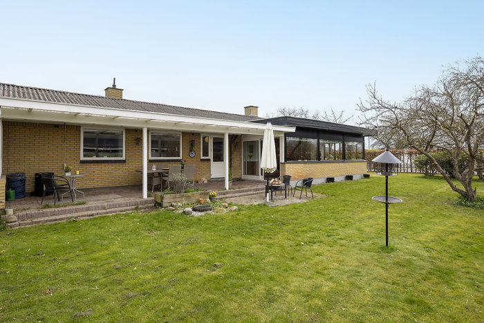 Huset er indrettet i ét plan med tre værelser, to badeværelser, køkken og gangarealer, der binder hjemmet sammen med det store leverum som centrum. Herfra er der adgang til en rummelig udestue med skydedøre, hvor I kan træde ud på den store grund, perfekt orienteret mod syd og vest – klar til sol og hyggelige stunder.