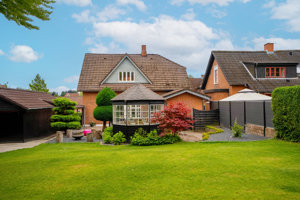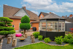 Haven er anlagt med stor plæne, dekorative bede og en charmerende pavillon, som skaber et ekstra opholdsrum tæt på huset. Stier, beplantning og de grønne omgivelser giver en indbydende ramme om udelivet og understøtter husets klassiske udtryk.