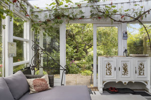 Haven er frodig og ugeneret. Terrassen giver mulighed for ophold i sol og skygge. Her er der god kontakt til den smukke beplantning og indgang til både bolig og udestue.