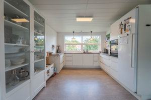 Køkkenet har store vinduer, som giver et flot lysindfald. Der er direkte adgang til både spiseafdelingen og resten af husets opholdsrum.