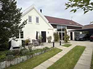 Villaen imponerer med sin flotte facade og en smuk, velanlagt have. Store døre og vinduer binder ude- og inderum sammen og skaber et lyst og luksuriøst udtryk. Terrassen og orangeriet indbyder til udeliv året rundt.