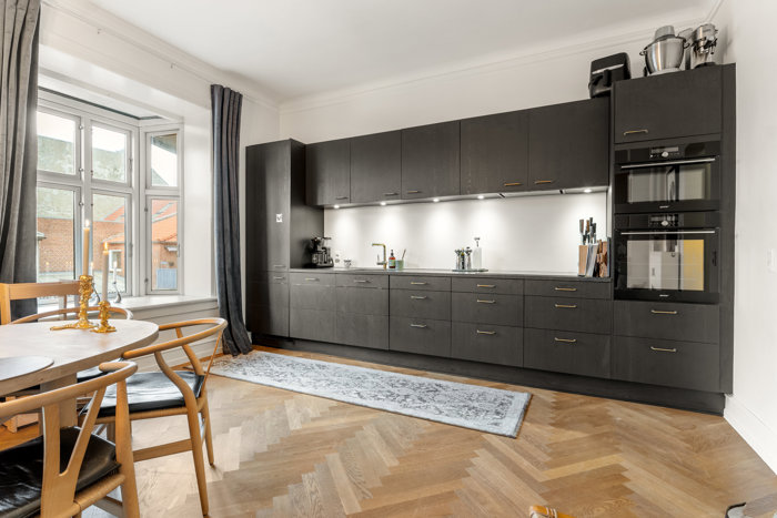 Køkkenet ligger åbent i forbindelse med alrummet og har godt lysindfald fra store vinduer. Her er der plads til fællesskab, madlavning og ophold. Planløsningen giver let adgang til resten af lejligheden.