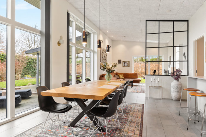 Køkken alrummet har store vinduer og loft til kip, hvilket giver et skønt lysindfald. Her er en naturlig sammenhæng til resten af boligen og direkte adgang til terrasse.