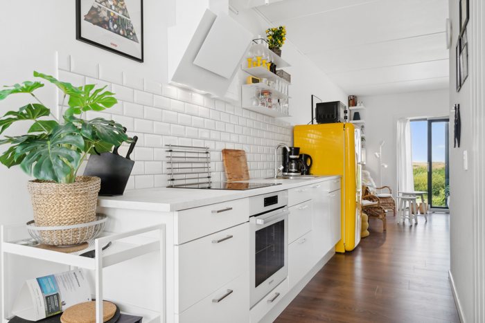 Køkkenet emmer af hygge og funktionalitet med vinduer, der lukker dagslyset ind og giver udsigt til haven. Her er der god plads og let adgang til både stue og udeareal.