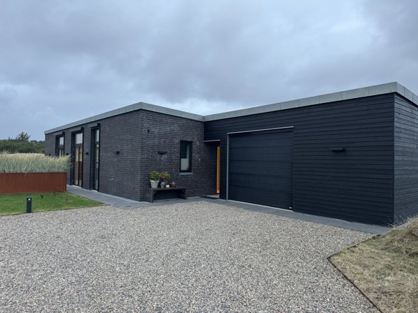 Villaen fra 2020 fremstår enkel og moderne med fladt tag og mørke tegl. De store vinduespartier åbner huset mod terrasser og klitlandskab, mens grunden glider naturligt over i de omkringliggende arealer og giver luft omkring boligen.