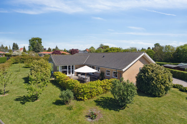 Den store, grønne have omkranser huset og giver luft omkring boligen. Terrasserne ligger godt i forhold til solen, og de tætte hække og beplantning skaber en ugeneret ramme med lange kig over de omkringliggende tage.