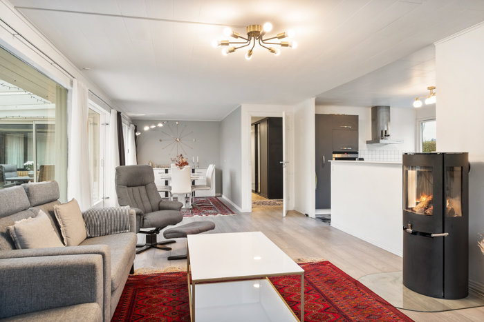 Stuen har loft til kip og store vinduespartier, der giver et generøst lysindfald og fin udsigt til haven. De høje glaspartier og terrassedøren skaber en naturlig forlængelse af rummet ud mod træterrassen og haven.