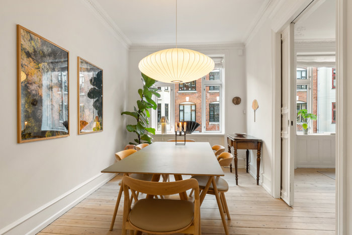 Fra alrummet følger boligens to stuer en suite. Det er ligeledes særdeles smukke rum med lyse plankegulve og bred stuk i loftet. Den ene stue kan naturligvis også anvendes som soveværelse, hvis I foretrækker det. Derudover får I også et egentligt soveværelse, som er indrettet med hems, hvilket giver rummet ekstra plads og muligheder. Sidst, men ikke mindst er der badeværelset, som har en fin glasbruseniche beklædt med Travertin-fliser.