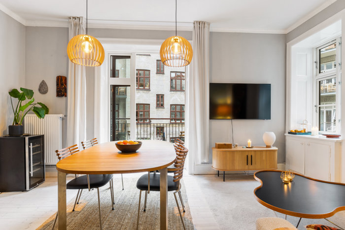 Lejligheden ligger perfekt på vejen lige overfor Folkvarsvej, hvilket giver et dejligt frit udsyn og et godt lysinfald i stuen Det er en førstesalslejlighed, hvor de rustikke gulvplanker, stukken i loftet og panelerne, fylder boligen med den helt rette Frederiksberg-stemning. I forbindelse med renoveringen i sommeren 2024 blev lejligheden også åbnet op, så der er åbent rumforløb mellem entré og køkken og mellem stuen og de to værelser, hvilket skaber bedre lysforhold og giver lejligheden et åbent feel. Der følger dog også en dør med, hvis du foretrækker at lukke lidt af ind mod det ene soveværelse.