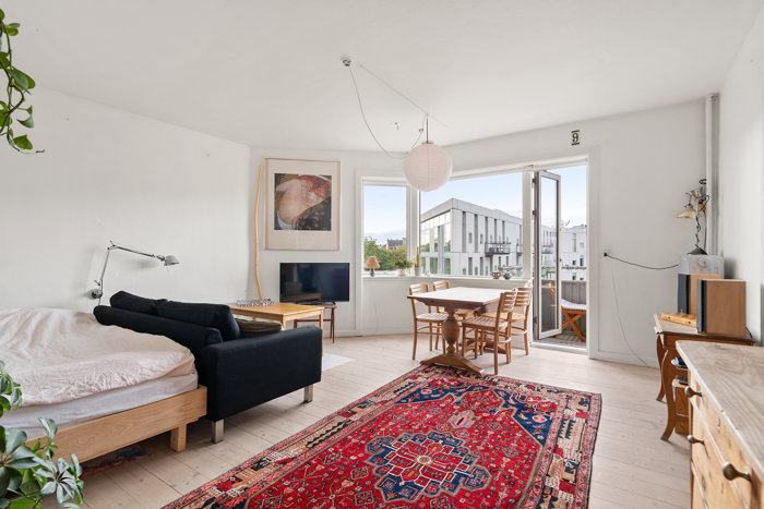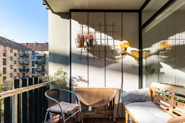Fra soveværelset er der adgang til en vestvendt altan med roligt kig til gården. Her kan du nyde eftermiddags- og aftensolen i fuld ro med god afstand til naboerne. Alle tre døre kan åbnes, så altanen smelter sammen med rummet og skaber en unik forbindelse mellem inde og ude.