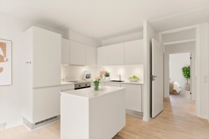 Køkken-alrummet tiltrækker mest opmærksomhed. Et skønt opholdsrum med et nydeligt, hvidt køkken med integrerede greb i fronterne og indbyggede hårde hvidevarer. Den tilstødende stue har udgang til altanen, som giver dig en dejlig udsigtspost, hvor du kan trække frisk luft og følge livet på gaden. Altanen er desuden sydvendt, så du får maksimal sol. Ønsker du en tættere en integration mellem stue og køkken-alrum, er der fin mulighed for at lave et større hul i væggen, så rummene bliver en suite.
