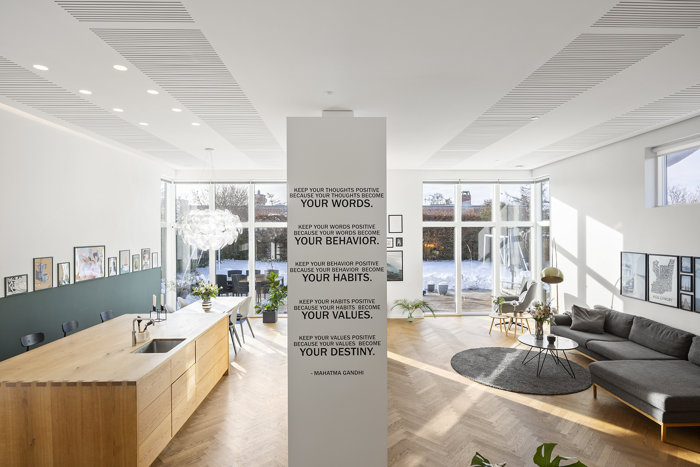 Boligen fremstår smagfuldt istandsat og indrettet med fokus på lys, luft og moderne komfort. Hjerterummet er det store, åbne køkken-alrum med stilrent Unoform-køkken i direkte forbindelse til den lyse stue med imponerende vinduespartier, indbygget brændeovn og udgang til en stor, solrig træterrasse og den skønne have. I stueplan finder du desuden tre gode og regulære værelser, et elegant badeværelse samt et praktisk gæstetoilet. Planløsningen er gennemtænkt og egner sig perfekt til børnefamilien såvel som det modne par, der ønsker god plads og en nem, funktionel bolig i ét plan. Der er indlagt fjernvarme, hvilket sikrer en bekvem og energieffektiv opvarmning.