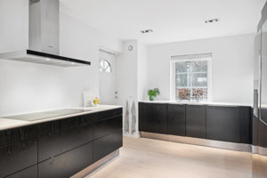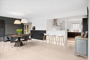 Stueetagen åbner sig med en elegant entré og et leverum, der tager pusten fra én. Store sprossevinduer fra gulv til loft sender dagslyset ind i det stilfulde rum, og atmosfæren føles næsten som et slot. Her er det let at forestille sig børn på gulvet, maden der simrer i køkkenet og hverdage med ekstra glans. Flere udgange fører ud til den private terrasse.