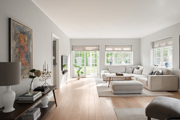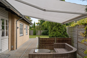 Køkkenet er elegant med flotte elementer, en smuk, massiv egetræsbordplade, hyggeligt spisehjørne med plads til hele familien, dæmpbare spots i loftet og en skøn, indbygget gaspejs, der skaber hygge og varme i de kolde måneder. Fra spisestuen er der dobbeltdøre, som åbner ud til en dejlig, rolig terrasse. Dertil en stor markise, som skærmer for solen eller duggen, når den falder. Den store stue ligger i åben forbindelse med køkken-alrummet og spisestuen og viderefører følelsen af lys og luft – samtidig med at den åbner sig mod den meget private have. Fra stuen er der dobbeltdøre med direkte adgang til haven og yderligere to dejlige, flisebelagte terrasser.