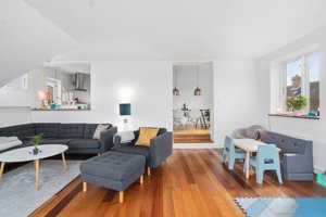 Villaen har en fælles trappeopgang, der leder op til afsats med plads til familiens overtøj og sko. Den velholdte og veldisponerede lejlighed er beliggende på førstesalen.