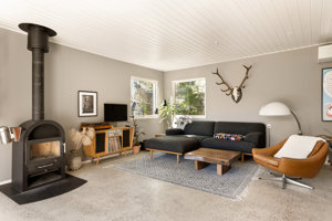 Stuen byder på et flot lysindfald fra de store vinduespartier og dobbelt terrassedør, der åbner op til den grønne have. Her oplever du en skøn fornemmelse af rummelighed og en glidende overgang mellem inde og ude.
