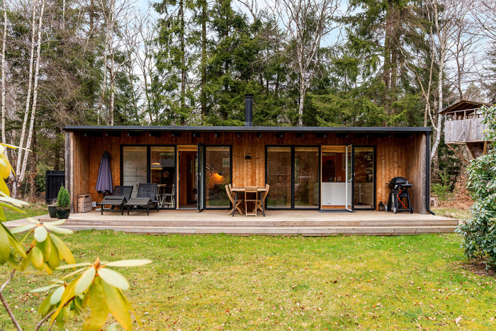 Indenfor møder I en indretning, der er både harmonisk og funktionel. Træbeklædningen med den flotte profil fortsætter gennem alle rum og giver huset en varm og indbydende karakter. Planløsningen rummer tre værelser, hvor det ene er større end de to andre, hvilket giver jer fleksible muligheder for både gæster, børn eller kontor. Badeværelset ligger centralt i forbindelse med entréen, og stuen fylder en væsentlig del af huset med god plads til spisebord og hyggelige ophold. Her gør de mange vinduer, at lyset strømmer ind og skaber en oplevelse af nærhed til haven. Køkkenet ligger i en semiåben forbindelse til stuen, så I nemt kan være sammen, mens maden tilberedes, og herfra er der direkte udgang til et overdækket terrasseområde, der forlænger opholdssæsonen.