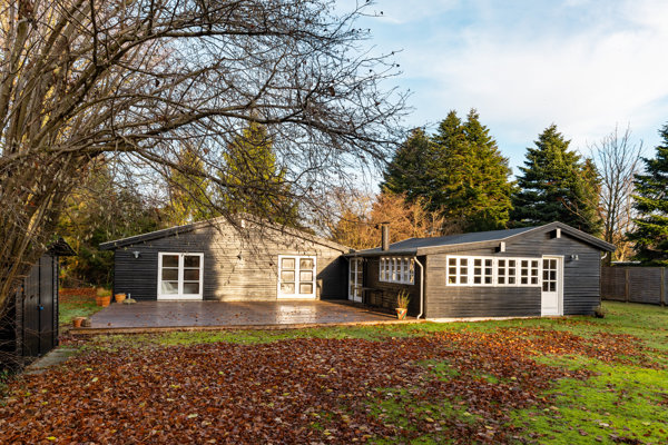 Det sorte træhus fremstår i en vinkelform med store vindues- og dørpartier mod terrassen. Den rummelige, grønne grund omkranser bygningen og giver et ugeneret udemiljø med god afstand til naboerne.