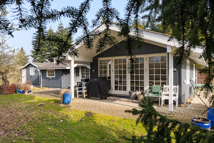 Husets facade fremstår flot og indbydende, med store vinduer, der byder på et flot lysindfald og udgang til de skønne udeområder. Her får du et hjem, hvor funktionalitet og æstetik går hånd i hånd.