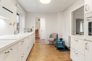 Du træder ind i et praktisk bryggers/entré, hvorfra der er adgang til ejendommens flotte badeværelse og videre til det nyere køkken. Køkkenet ligger i direkte forbindelse med de to stuer en suite, som skaber et åbent og fleksibelt opholdsareal. Her kan du nemt indrette både spiseafdeling og sofaområde, mens den nyere brændeovn er centralt placeret og sørger for varme og hyggestemning i hele stueetagen.