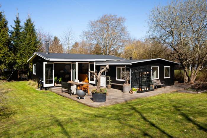 Her præsenterer ejendommen sig med sort facade og hvide detaljer, der harmonerer smukt med de naturskønne omgivelser og giver et tidløst, indbydende udtryk.
