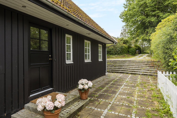 Den private terrasse er omkranset af frodig beplantning og hæk, hvilket giver både sol, ro og privatliv ude. Herfra kan haven nydes dagen lang og terrassedøren forbinder ude og inde.