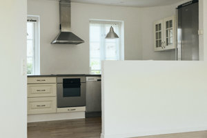 Køkkenet byder på rene linjer og et skønt lysindfald via flere vinduer. Her er nem adgang til hyggelig have og terrasse, der trækker udelivet ind i boligen.