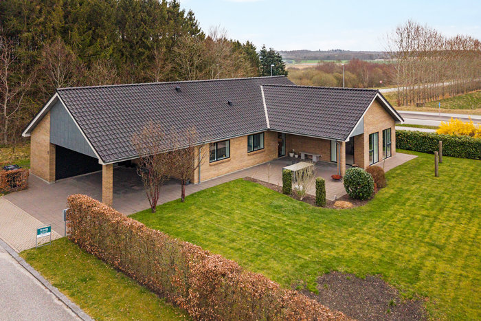 Villaen fremstår moderne og velholdt med lyse mursten og mørkt tag. De store vinduespartier giver et indbydende udtryk og fin kontakt mellem inde og ude, mens de brede terrasser binder huset naturligt sammen med haven.
