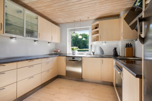 Køkkenet er indrettet med gode arbejdsflader og store vinduer, der sikrer et dejligt lysindfald. Direkte adgang til alrummet og videre ud til terrassen binder boligens hjertet sammen.