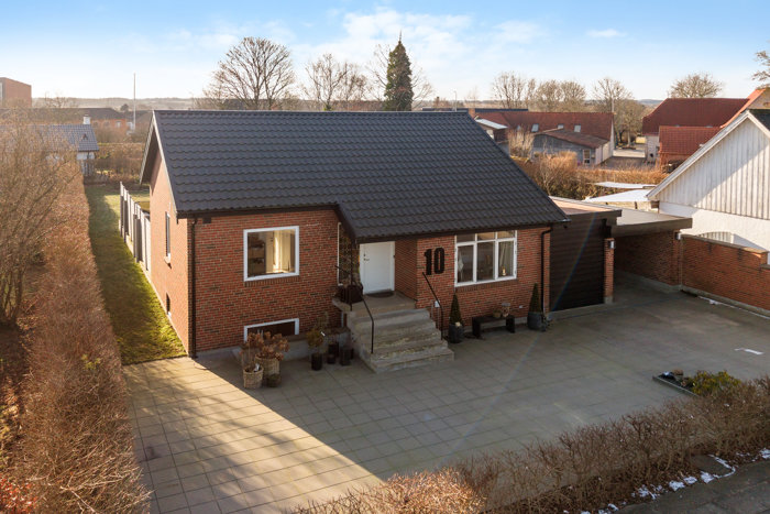 Den smukke røde murstensvilla fremstår indbydende fra flere vinkler og giver et skønt udemiljø med masser af plads. Udestuen og de store vinduespartier trækker haven helt tæt på hverdagen.