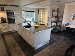Køkkenet fremstår åbent og rummeligt med flotte materialer og masser af dagslys. Fra køkkenet er der nem adgang videre til spise- og opholdsrum.