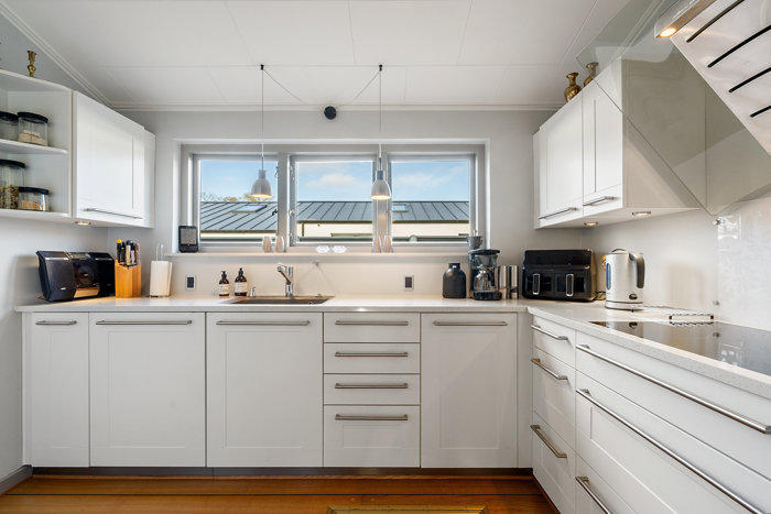 I stueplanet finder I villaens naturlige samlingspunkt. Køkkenet har hvide, tidløse fronter og rigelig bordplads og glider sømløst over i spisestue og opholdsstue med brændeovn. Her får I rum til både hverdagsro og gæstebesøg, og skydedørene til terrassen gør det let at invitere haven helt med ind i stuen.